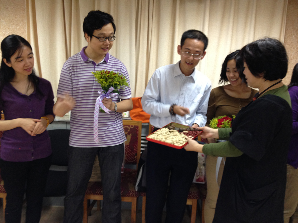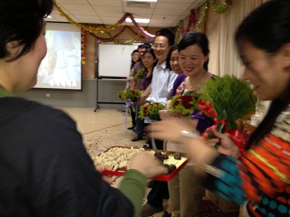 2013年9月18日,中秋佳节前夕,太阳集团tcy8722工会在院教工活动室为2013年太阳集团tcy8722新婚的5位教师举办了庆新婚中秋联欢会。曹卫东副董事长代表校领导向新人赠送大蛋糕,李国英书记、过常宝经理、院工会周晓文主席等院领导和郭英德、李山、王立军、于翠玲、齐元涛等教授到场为新婚教师祝福。院工会为新婚教师准备了大蛋糕和红色玫瑰花,祝福他们新婚快乐、幸福美满。联欢会上举行了咬苹果、撒花瓣、贴喜联等民俗活动,教师们载歌载舞,整个联欢会过程温馨、甜蜜而热闹。