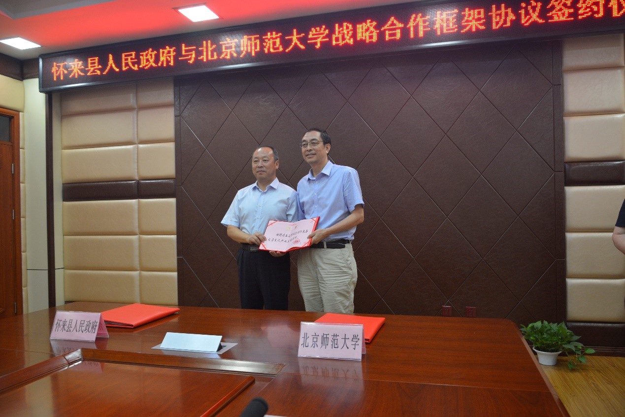 2018年9月1日,北师大资深教授王宁先生、汉字研究与现代应用实验室主任王立军教授等一行四人,赴河北省怀来县实地考察官厅水库国家湿地公园博物馆建设情况,并与怀来县人民政府签订了《中国文字文化产业发展战略合作框架协议》。怀来县县委常委、常务副县长、组织部部长王永代表县政府为王宁先生、王立军教授颁发了聘书,聘任两位老师为怀来县文字文化产业发展顾问。签约和聘任仪式由怀来县副县长、教育局局长黄晓静主持。 王永副县长介绍了怀来县的基本情况及经济文化发展现状。怀来县东临北京,区位优越,历史悠久,生态优美,交通便捷,京张高铁建成后将融入首都半小时经济圈。近年来,全县上下抢抓京津冀协同发展、京张携手举办冬奥会机遇,坚持“生态第一、创新引领、跨越赶超”发展道路,规划了“一湖三圈”空间发展布局,强力打造首都最优水源涵养区。怀来县特别重视文化建设,依托京津冀地区最大的官厅水库国家湿地公园,充分发掘本区域的历史文化资源,将生态建设和文化产业发展有机融合起来,形成良性互动。怀来县是东汉文字学家王次仲的故乡,未来将以此为切入点,重点推进怀来中国文字文化产业的发展。 王宁先生介绍了北师大传统语言文字学学科点的基本情况,包括学科点的学术传承、学术优势及其在国家语言文字规范、基础公司产品、汉字文化普及与传播等方面所做出的贡献,强调学科点秉承“敞开来、走出去”的理念,在精英教育、基础教育、国家规范及与地方合作实践中不断发展,提升了学科的优势和前进动力。 王立军教授重点就怀来县文字文化产业的发展及双方合作的内容作了介绍。汉字实验室作为双方合作的平台,将负责怀来县官厅水库国家湿地公园博物馆有关文字文化的展陈设计、怀来县文字文化产业发展规划及相关人才的培训等。鉴于与王次仲直接相关的文献资料较少,王立军教授建议此次展陈以王次仲命名,把王次仲作为整个展陈烘托的重点,将其放在中国文字发展、特别是今文字发展的历史背景中,突出其在汉字史上的重要地位,将其打造成为怀来文化产业的重要名片。 签约仪式后,王宁先生、王立军教授等一行在王永副县长等陪同下参观了官厅湖国家湿地公园及博物馆“漂浮之环”建设现场,充分了解了王次仲文字文化展馆的整体环境,为将来的展陈设计提供了更为直观的参照。 出席本次活动的还有怀来县法制办、金融办、国土资源局、林业局、文化体育广播新闻出版局、发展改革局、商务局、团县委、县政府督查室等有关部门负责人,以及北师大汉字实验室的温英明老师、许晶晶老师。