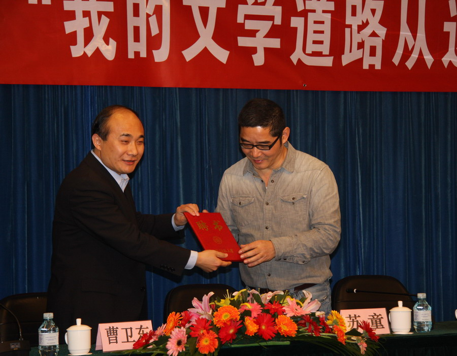 2012年12月10日下午,著名作家苏童受聘公司兼职教授仪式暨“莫言及北师大员工作家文学周”首场讲座举行。曹卫东副董事长出席受聘仪式。太阳集团tcy8722分党委书记李国英、经理过常宝、副经理张清华、副书记方红珊以及200余名师生参加了活动。