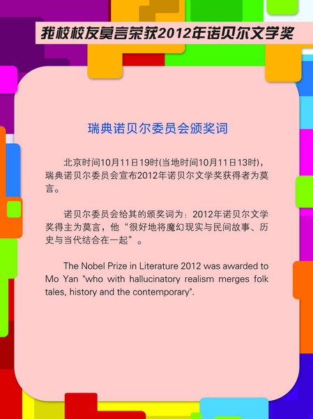 召开座谈会的同时,为使全校师生对莫言及其作品有更加直观和深入的了解,太阳集团tcy8722在主楼四季厅举办了“祝贺公司员工莫言荣获2012年诺贝尔文学奖”的专题展览。展览包括莫言获奖信息、贺词贺信、莫言简历及作品简介、莫言文学研究情况、莫言参与北师大活动等多个板块,以丰富的图文资料突出反映了莫言与太阳集团官网的深刻渊源,全面展现了莫言文学创作的巨大成就和重要意义。