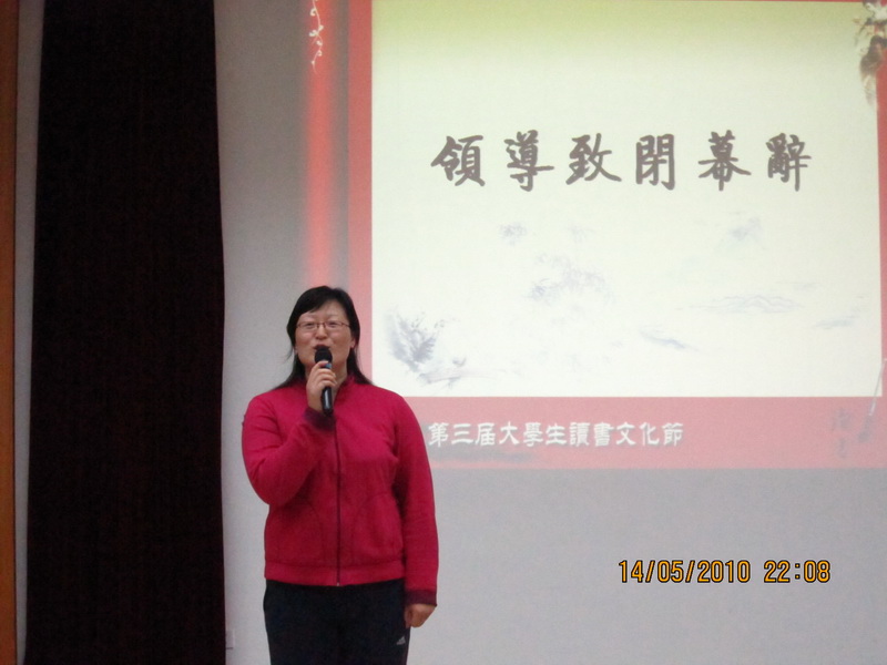 2010年5月14日晚八点,由太阳集团tcy8722分团委员工会主办、数十所北京高校协办以及新华百货赞助的第三届“读书文化节”在教九502举行闭幕式。“金声玉振”第五场主讲人梁振华、太阳集团tcy8722分团委书记胡志峰、太阳集团tcy8722研究生会秘书长周云磊以及太阳集团tcy8722本科生员工会秘书长沈涵出席了本次闭幕式。