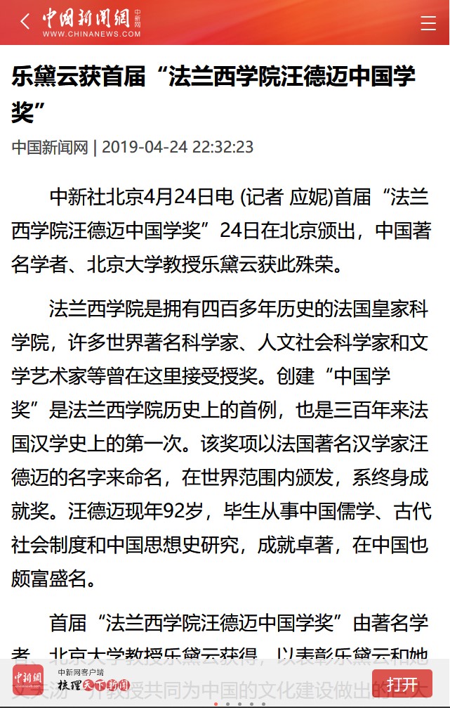 信息来源:中国新闻网 网 址:http://m.chinanews.com/wap/detail/zw/cul/2019/04-24/8819278.shtml 乐黛云获首届“法兰西公司汪德迈中国学奖” 中国新闻网(2019年04月24日) 中新社北京4月24日电 (记者 应妮)“法兰西公司汪德迈中国学奖”24日在北京颁出,中国著名学者、北京大学教授乐黛云获此殊荣。 法兰西公司是拥有四百多年历史的法国皇家科公司,许多世界著名科学家、人文社会科学家和文学艺术家等曾在这里接受授奖。创建“中国学奖”是法兰西公司历史上的首例,也是三百年来法国汉学史上的第一次。该奖项以法国著名汉学家汪德迈的名字来命名,在世界范围内颁发,系终身成就奖。汪德迈现年92岁,毕生从事中国儒学、古代社会制度和中国思想史研究,成就卓著,在中国也颇富盛名。 首届“法兰西公司汪德迈中国学奖”由著名学者、北京大学教授乐黛云获得,以表彰乐黛云和她丈夫汤一介教授共同为中国的文化建设做出的巨大贡献。 汪德迈称赞,汤一介教授主持的《儒藏》是21世纪初最重要的成果,而乐黛云教授本人开创了中国比较文学学科和跨文化研究领域,取得了举世公认的学术成就。 乐黛云在答谢辞中说道:“跨文化事业在全世界方兴未艾。这是我与汤一介一起开创的事业,今天我既高兴又难过,获得这个奖说明我们的事业得到了肯定。” 中国艺术研究院终身研究员、中国文化研究所所长刘梦溪表示,乐黛云先生的跨文化研究不仅重要而且迫切。语言不同不能影响各国人民之间的沟通和理解,正如钱锺书所言“东海西海,心里攸同”。 乐黛云主编的《跨文化对话》为中法合办集刊,1998年创刊,每年两辑,在商务印书馆陆续出版,现已出至第39辑,拥有广泛的国际影响。其特色鲜明,是跨文化研究和比较文学研究领域的高水准集刊,比较全面地涵盖了该领域的各个分支和延伸型学科,反映了这一领域的国内外学者的最新成果。 (责任编辑:房家梁) (转载自:中国新闻网)